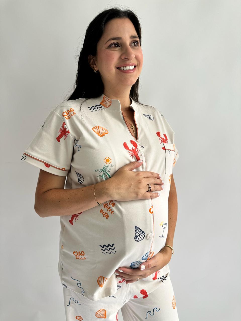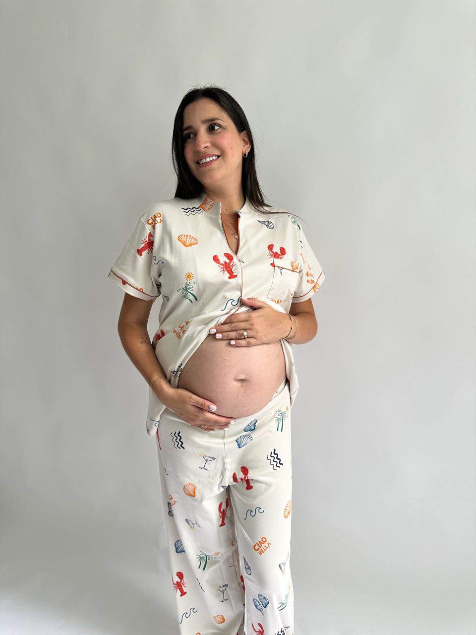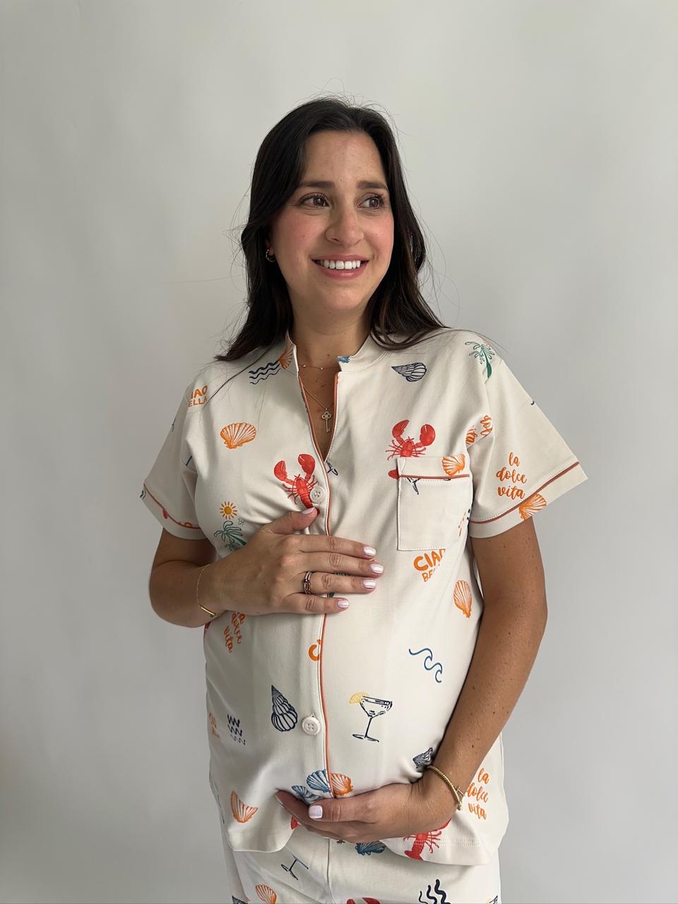 Nuestro print Dolce Vita en versión camisa y pantalón. Un conjunto ligero y cómodo, ideal para los días de verano. Perfecto para acompañar a mamá desde las noches cálidas hasta las mañanas tranquilas en casa, siempre con un look relajado y especial. 💗