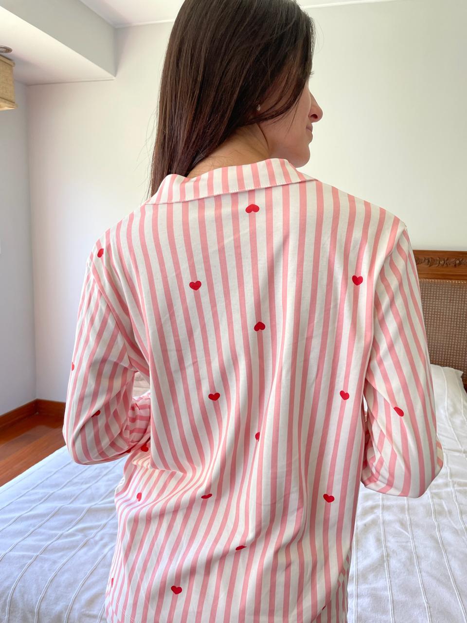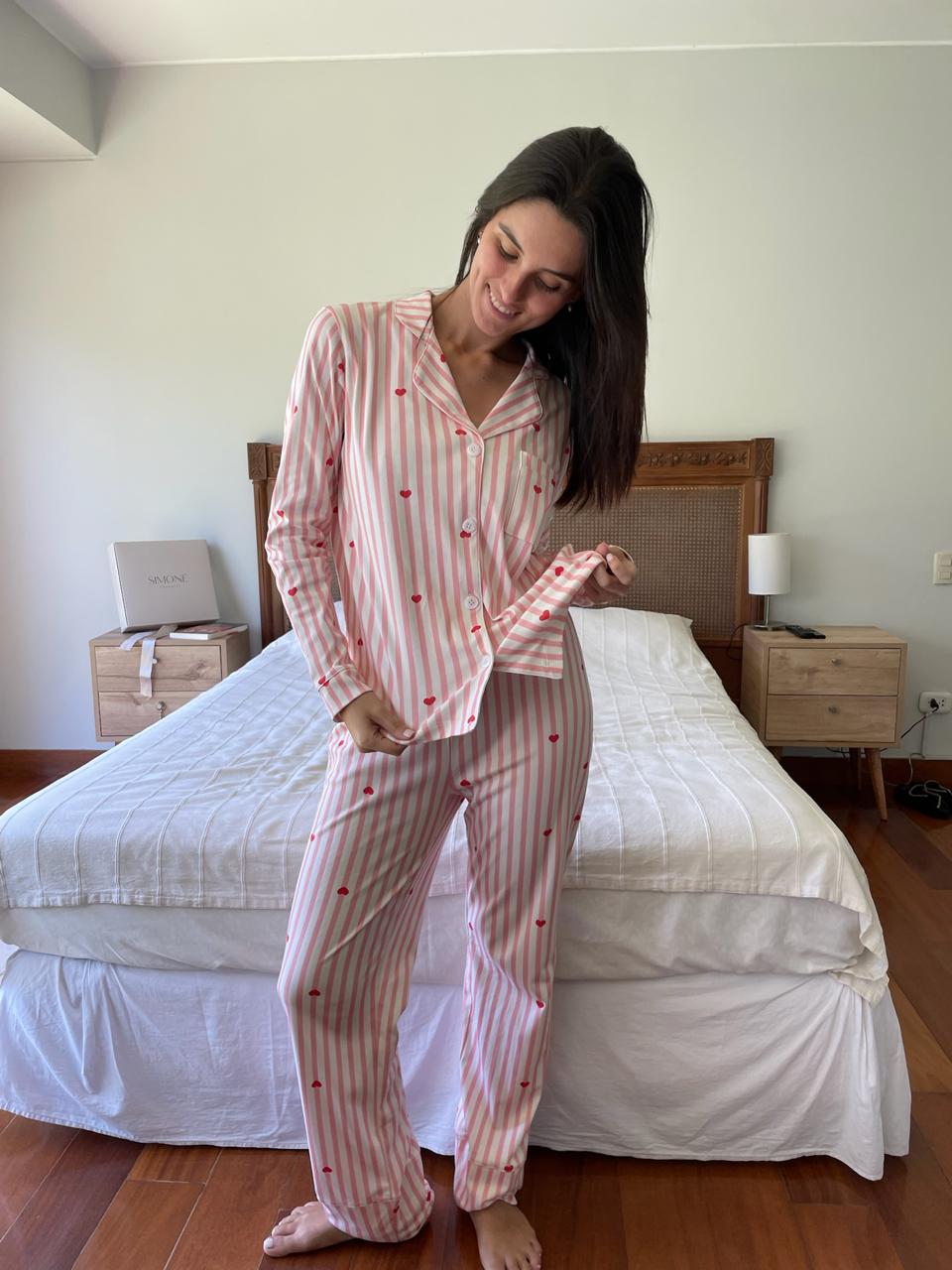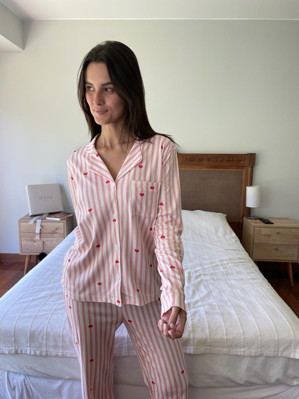 Love Me Do, Nuestra Pij de algodón pima extra suave, ideal para descansar con total comodidad. Su diseño de rayas y pequeños corazones le da un toque romántico y divertido. Perfecto para noches relajadas, mañanas sin prisas y llenas de encanto. 💗
