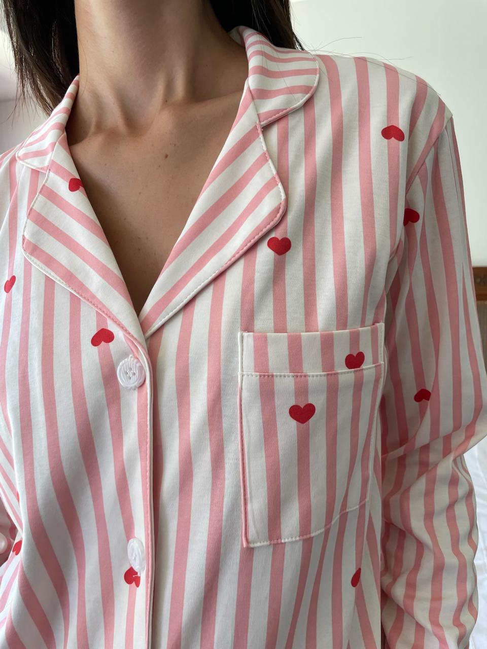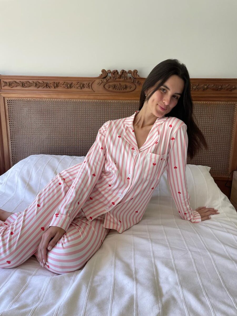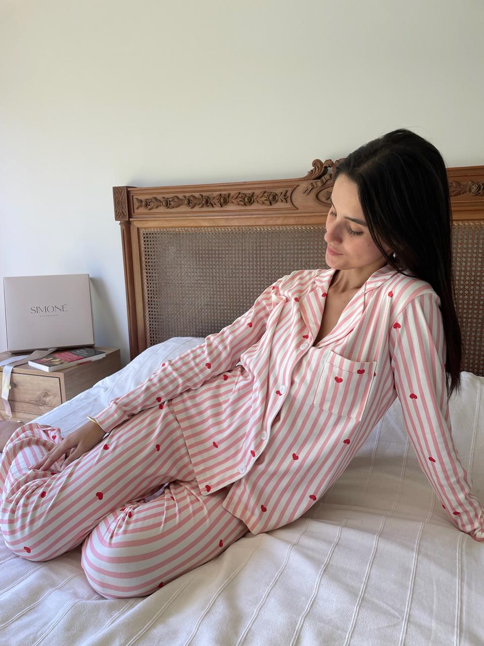 Love Me Do, Nuestra Pij de algodón pima extra suave, ideal para descansar con total comodidad. Su diseño de rayas y pequeños corazones le da un toque romántico y divertido. Perfecto para noches relajadas, mañanas sin prisas y llenas de encanto. 💗